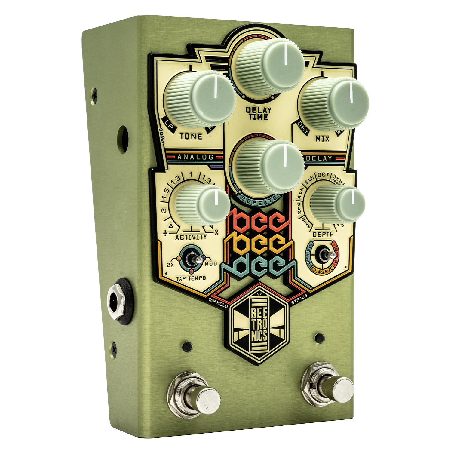 BeeBeeDeeは皆が愛するクラシックなサウンドをベースに、まだ見ぬアナログディレイの可能性を探求するべくデザインされたペダルです。BEETRONICSらしいウォームでリッチなサウンドを生み出すアナログ回路を、正確なデジタル回路で完璧に制御。ディレイタイムをランダムに捻じ曲げたり、リズミカルにハーモナイズするピッチシフトを生み出したりと、どんなビンテージ回路にも無い方法で動きを付けることができます。
