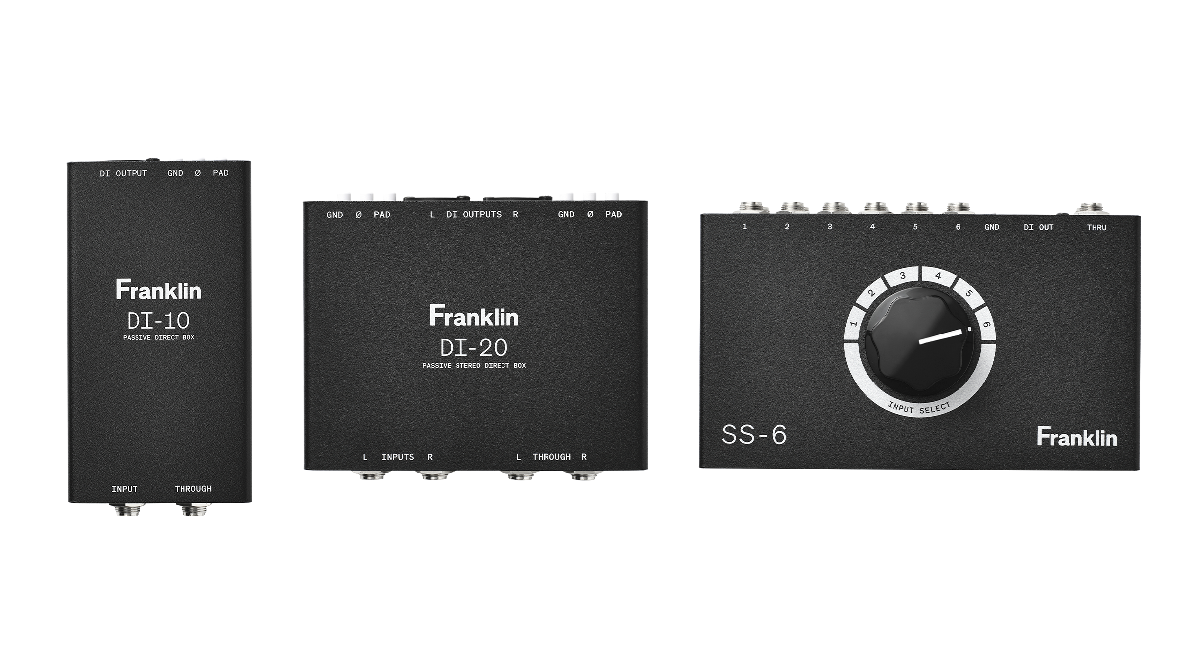 2025年8月8日現在、Franklin AudioはDIとリアンプボックス、そしてモニタースイッチャーのをラインナップ。全ての製品は共通して取り回しの良いパッシブ設計、コンパクトなサイズ感と邪魔にならないデザイン、そしてイメージを損なわないクリアでナチュラルなサウンドが特徴です。