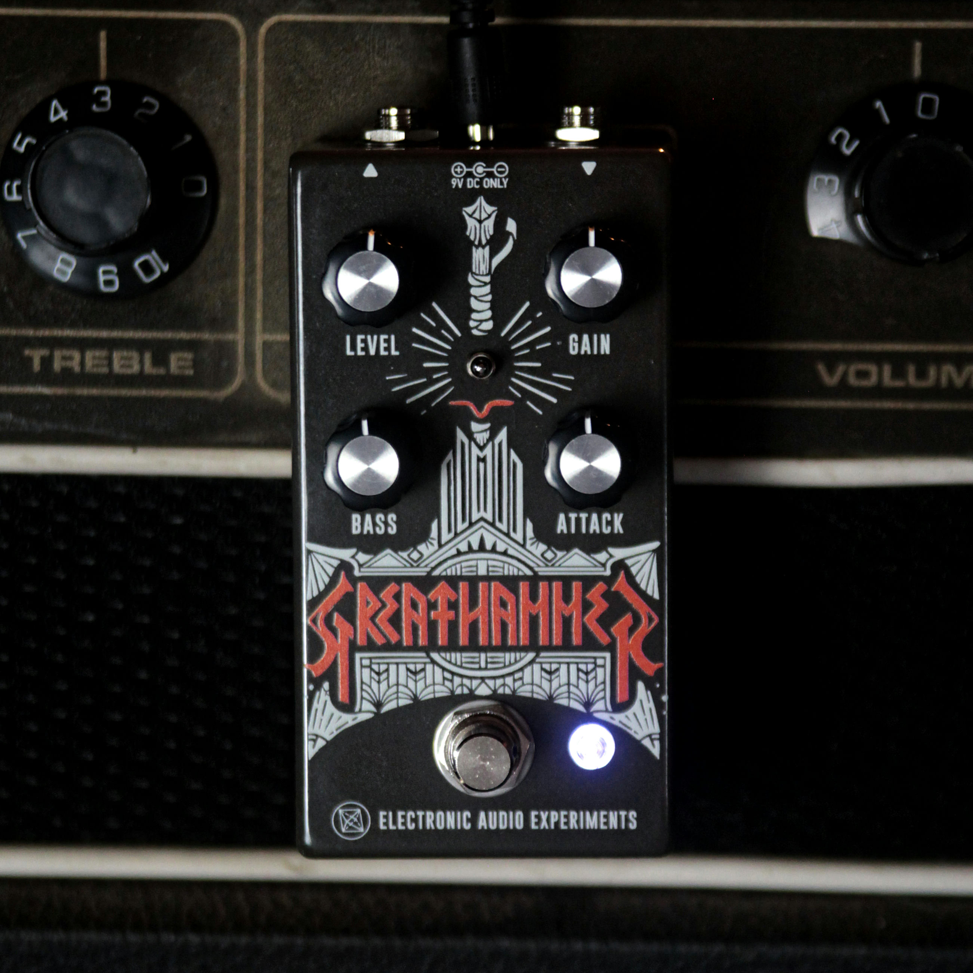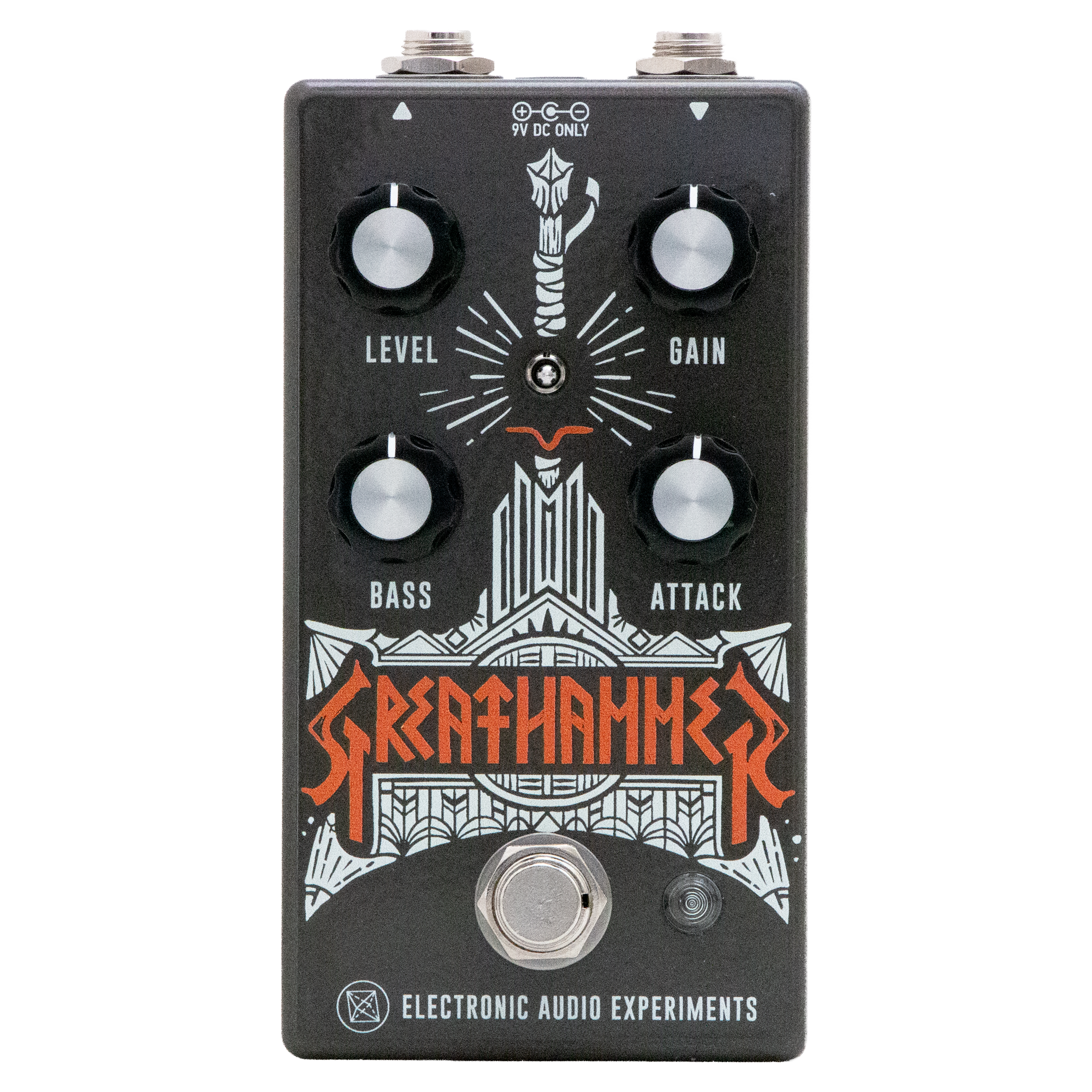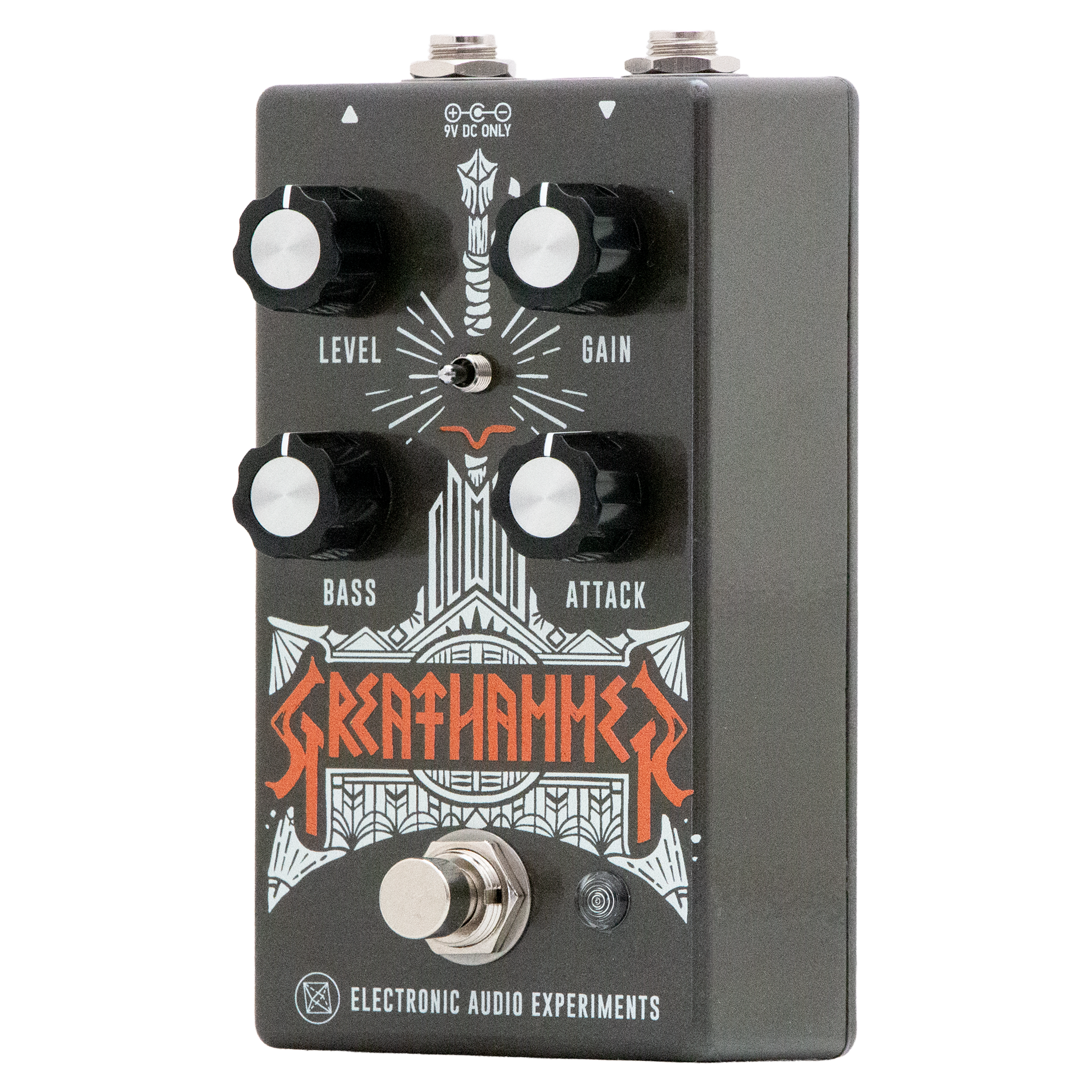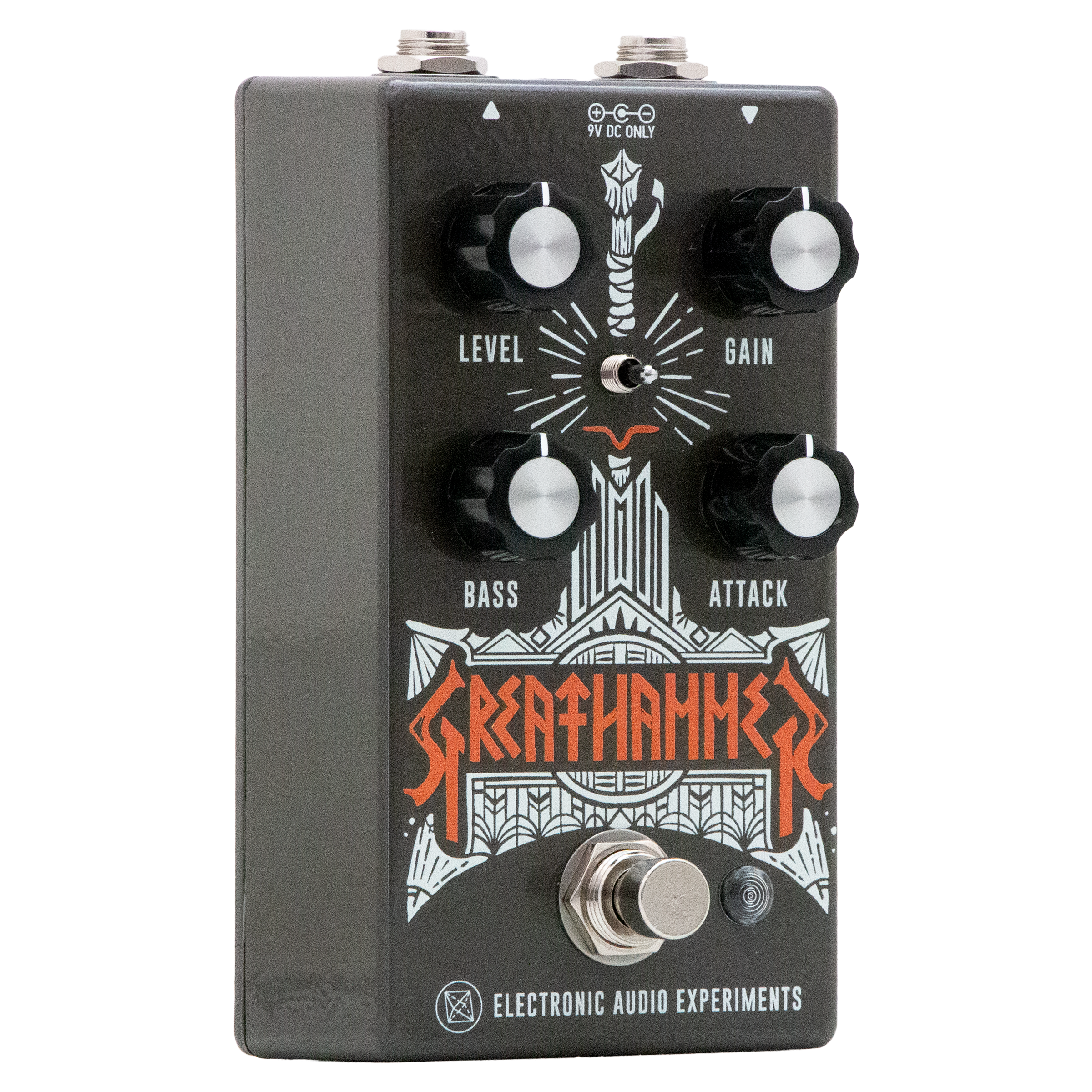 Greathammerはギャリギャリと軋むドライブサウンドに、迫撃砲のようなローブーストを加えたベースドライブペダルです。金属的なノイズロックやポストハードコアのサウンドを支えたソリッドステートアンプを出発点として開発されましたが、このペダルのために回路設計全体が再デザインされています。